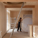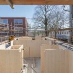 In dit project kwamen vijf houtbouwsystemen samen: CLT, HSB, Baubuche, ronde vuren stelkozijnen en een 3S-plaatje voor de strakke afwerking aan de binnenzijde van het dak.